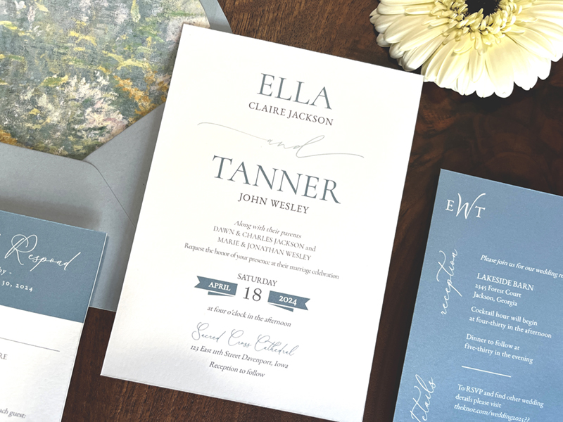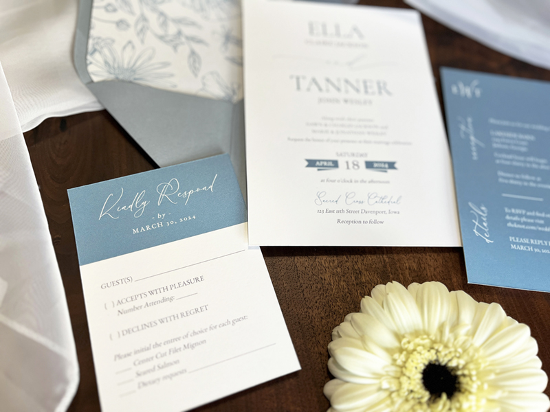 The information, ink color, envelope colors and paper choice will be customized to your day, but the design layout will remain the same. To order, choose your quantity, paper type, colors for both envelopes on the Order Page. After sharing your choices, we will email your estimate and a form to you to complete with wording and customization options for your suite.