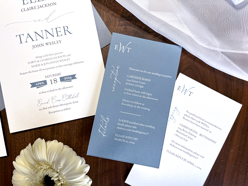 Invitations and cards printed in full-color on premium cotton paper and quality envelopes. If you would like to add or remove items from this suite, please add a note in your order and we’ll do a special estimate for you.