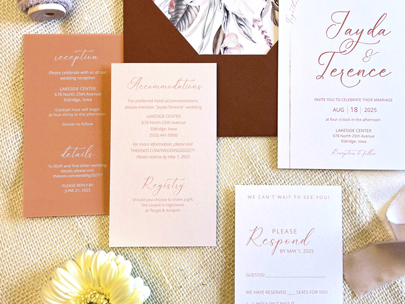 Invitations and cards printed in full-color on premium cotton paper and quality envelopes. If you would like to add or remove items from this suite, please add a note in your order and we’ll do a special estimate for you.