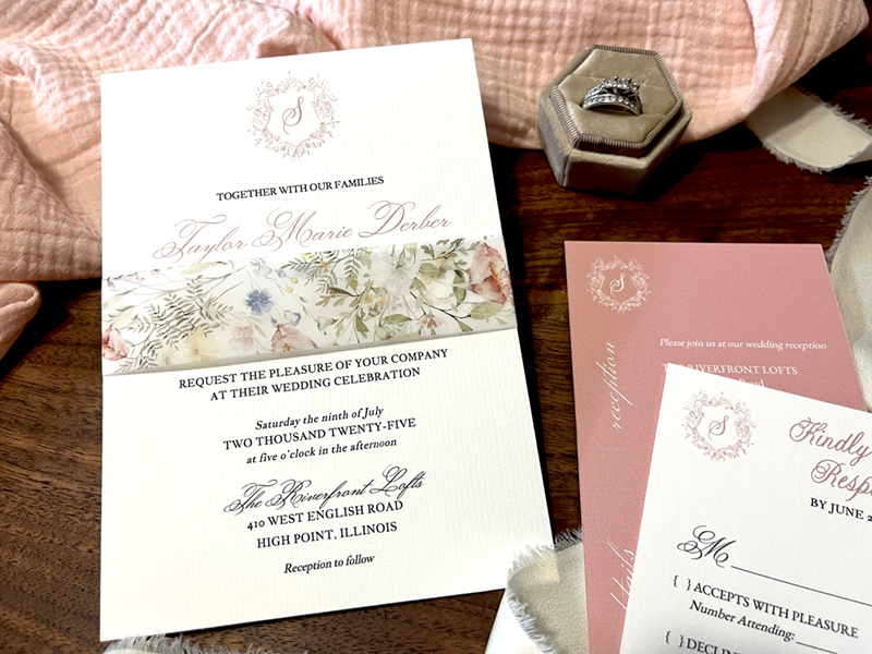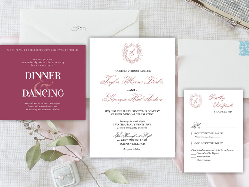 The information, ink color, envelope colors and paper choice will be customized to your day, but the design layout will remain the same. To order, choose your quantity, paper type, colors for both envelopes on the Order Page. After sharing your choices, we will email your estimate and a form to you to complete with wording and customization options for your suite.
